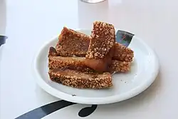 A staple of bar tops in Spain, torreznos temporarily lost popularity to some extent due to its highly caloric nature.[1] They are also sold as snack in supermarkets. They are made of the outer part of the pork belly, marinated with salt and paprika, cured (or also smoked), and later fried.[1][2] Associated with Soria, torreznos produced there have been granted a specific marca de garantía.[3] Back in 2014 The Guardian described torreznos as "deliciously decadent fried pork belly chunks".[4][5][6]