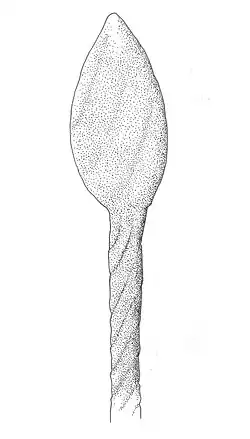 Whilst it is generally accepted that Tortilicaulis was moss-like, it has not yet been recovered in a sufficiently good state of preservation to allow the detailed study necessary to firmly assign it to a taxonomic group. Fossils consist of an elongate apical sporangium (spore-forming organ), which may be branched, with spiralled walls attached to an undivided stalk that is also twisted.[3][5] Unusually for plants of its time, spores of Tortilicaulis were covered all over with small granules.[6][7]