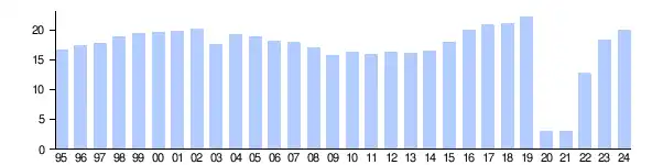 In 2023, non-Canadian visitors made 27.2 million trips to Canada, with U.S. residents contributing the most, accounting for 21.2 million of those trips. The total spending by tourists reached $12.9 billion for U.S. residents and $12.6 billion for overseas visitors.[2] Domestic and international tourism combined directly contributes 1% of Canada's total GDP and supports 309,000 jobs in the country.[3]