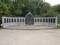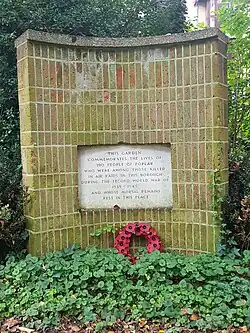 There are 279 Commonwealth service personnel of both World Wars buried here, the names of all being listed on bronze panels on a screen wall memorial in the Mile End section of the park near the entrance on Southern Grove, as are those of four Dutch merchant seamen. Nine British merchant seamen are buried here who were killed when their ship, SS Bennevis, was hit by a high explosive bomb on 7 September 1940, while berthed in the West India Docks, during an air raid in World War II.[8][31]