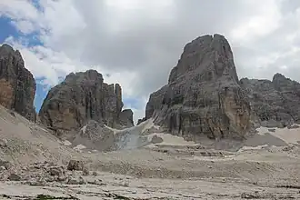 ![]() Tower of Brenta (3,014 m) and Cima degli Armi (2,951 m, left), separated by Bocca degli Armi (2,744 m) and the remnants of the Armi Glacier, as seen from Rifugio Angelo Alimonta. | |