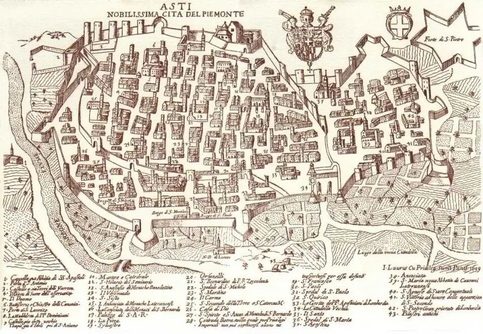 (Copper engraving by Jacopo Lauro called "Asti, Nobilissima città del Piemonte 1639" from Guido Antonio Malabaila's book, "Compendio historiale della città d'Asti". Rome 1638).