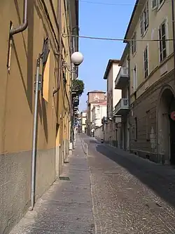 Via San Martino, the rear parallel of Via Roero that, starting from the church of the same name, descended skirting the palace and tower of the Roero family of Cortanze to arrive in Piazza San Giuseppe, was remembered as the street of the "lesa" (because being downhill, kids used it to "slide" during the winter months when it was covered in snow)[52] or the street of the "dead" (since funerals used to take place at the parish cemetery of San Martino in the 18th century).[53]