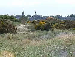 Formerly part of the Supercontinent of Rodinia as evidenced by the discovery of Dalradian Supergroup rocks, Nairn encompasses a 2.6 mile by 1.5 mile position on the mouth of the River Nairn and is fronted by the North Sea at the Moray Firth with two extensive beaches. The east beach being predominantly sand with dune vegetation (such as marram grass) and the west having more rock though becoming more sand as it reaches the river mouth. The Culbin Sands forms part of one of the most extensive areas of stabilised blown sand in Britain. The soil by the coast is largely a thin and loose organic layer developing directly on the sand and this has been strengthened in areas such as Culbin for forestry.[4]
