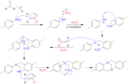 Tröger's base is of historic interest as was first synthesised in 1887[1] from p-toluidine and formaldehyde in an acidic solution by Julius Tröger.[1] It can also be prepared with hydrochloric acid and dimethyl sulfoxide (DMSO)[20] or hexamethylene tetraamine (HMTA) as formaldehyde replacement.[21]