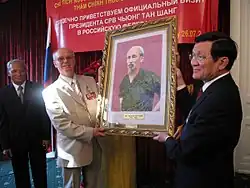 Trương Tấn Sang (Vietnamese: [t͡ɕɨəŋ˧˧ tən˧˦ saːŋ˧˧]; born 21 January 1949) is a Vietnamese politician, who served as the eighth President of Vietnam from 2011 to 2016. He was one of Vietnam's top leaders, alongside prime minister Nguyễn Tấn Dũng and Party general secretary Nguyễn Phú Trọng.[1] In July 2011, Trương Tấn Sang was elected state president of the Socialist Republic of Vietnam by the National Assembly of Vietnam and nominated by his predecessor Nguyễn Minh Triết who retired from office.