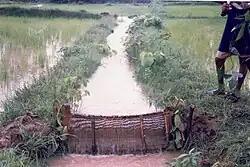 Reported from Mendha, this is a rectangular trap of bamboo sticks (locally called kaduhu) interwoven by nylon threads (originally made of fiber from the boyal tree were in use). This is a passive method of fishing. Virtually this trap operate on a 'funnel' or 'maze' principle, with fish passing easily through an entrance hole, but being confused by the blind endings within the trap and being unable to find their way out. The dimensions of box vary as per need, but standard size is 2.5 feet (0.76 m) to 5 feet (1.5 m) long, 0.5 to 1 foot (0.30 m) wide and 1 to 1.5 feet (0.46 m) high. This structure has 2 to 3 doors on both sides. The entrances or doors are very specialized structures, work as one-way valves, due to this valve fish can enter inside but cannot escape. The diameter of the doors is 2.5 cm (1 in) wide, so that fish of this much of size can only be caught. Dhiri are set in running water generally in night. The setting of the dhiri is laborious work and needs about 1 hour time. This can only set in at least 0.5 foot (0.15 m) deep water (so that water level should be slightly above the door) with the help of rope, mud and branches of the trees. Fishes moving along with stream of water enters into the doors. About 1 kg to as much as 10 kg live fish can be caught without any physical damage. Another morning or after 4 to 5 hours fish can be collected from the upper hole. Sometimes water snakes are also caught in the dhiri.(Heda, 2007)