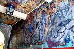 A number of markets are considered historic places. The Abelardo L. Rodriguez Market is located in the historic center of Mexico City, just northeast of the main plaza, or Zocalo. It was built in 1934 as a prototype for a more modern marketplace and has a number of unusual features such as day care and an auditorium.[22] However, the markets most distinctive feature is the approximately 1,450 square meters of wall and ceiling space covered in murals.[23] These murals were painted by students of Diego Rivera and under his supervision.[22] The works mostly reflect socialist themes, such as the exploitation of workers, peasants and miners, the fight against Nazism and fascism, and racial discrimination.[23] Earthquakes, time, humidity and vandalism took their toll on the murals from the time they were painted.[22][23] Restoration of the murals began in 2009.[23]