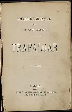 "Trafalgar" is a novel by Spanish author Benito Pérez Galdós[1] and the first novel of the first series in the Episodios Nacionales (National Episodes). It was first published in 1873 in Spain. The novel is set at the beginning of the 19th century and narrates the Battle of Trafalgar during the Napoleonic Wars.