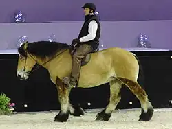 In France, the National Stud regulates the physical standards of the Trait du Nord and eight other French breeds. The eligibility criteria have changed several times since the opening of the studbook in 1913, and now describe the ideal Trait du Nord as large, well built, short and powerful, with a large frame and well-developed muscles, energetic, with easygoing and beautiful gaits.[1][4] Members of the breed are described by the breed association as courageous and observant,[10] as well as gentle and easy to handle.[5] The head is generally small in proportion to the mass of the horse, and often snub, with a flat profile (neither concave nor convex). The neck is of medium length and strong, often slightly arched. The withers are prominent and the shoulder long and slightly oblique. The back is short and straight and the body compact, solid and very muscular. The chest is deep, with a broad, muscular breast. The croup is wide and powerfully muscled. The hooves are hard and strong.[1][4]