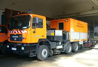 A MAN truck with crane and drawbar for pulling, rerailing, and shunting trams in Munich, Germany.