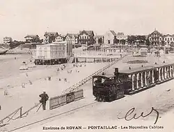 Steam tramway, ready to depart from Grande-Côte, 1904A steam train at the Casino de FoncillonSteam tramway in the sea-side resort of PontaillacSteam tramway at Café des Bains in Royan, 1930sInauguration of a Campagne petrol railcar (Automotrice) by Gaston Nougarède, director of the SGTR on the left in front of the railcar with black cap. View of the inaugural train departing from Ronce-les-Bains for the return journey of the guests, 1924.[3]