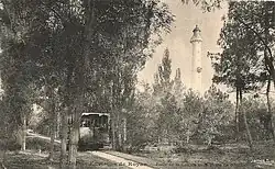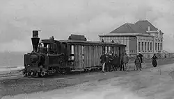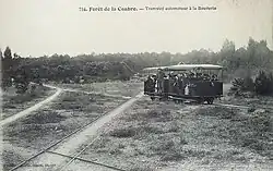 The metre-gauge forest railway originally started at the La Combe à Massé quarry in 1868. Initially used mainly by workers and employees for silvicultural work, the forest railway was also used by summer visitors after reforestation was completed. In the newspaper Le Gaulois of 21 July 1884 and 11 August 1884, an advertisement appeared for "visits by forest railway to La Palmyre, La Coubre, the Pavillon Bonne-Anse, the Pointe Espagnole, the Galon d'Or, the forest and dolmens of Combots, the forest of Arvert, etc."[4][17]