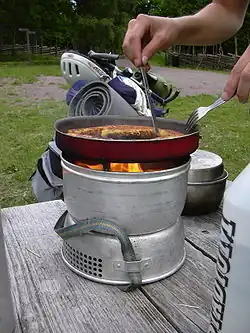 Trangia is a line of alcohol-burning portable stoves manufactured by Swedish company Trangia AB in Trångsviken. These stoves are designed primarily for backpackers, with a focus on light weight, durability and simple design. The company began in 1925,[1] selling cookware. The Trangia stove was developed by 1951.[1] Trangia stoves were initially preferred to kerosene (paraffin) pressure stoves because they required only one type of fuel (alcohol, usually in the form of cheaper but deliberately poisonous methylated spirit).[2] Trangia's selling point is that the entire packaged stove, including pots, is not significantly larger than a standard camp cooking pot. For this reason the Trangia has retained much of its popularity despite the development of alternative stove fuels and designs.