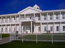 By 1996, it was referred to as the "Maharishi Continental Capital of the Age of Enlightenment for Europe".[225] In 1998, the overall redevelopment plan for the location was budgeted at USD 50 million.[221] Aerial photographs show the development of the site.[226][227] Floodlights illuminated the new building constructed in 1997 and 164 flagpoles carried the flags of the world nations "like a meditation-based United Nations."[228] Local authorities later limited the use of floodlights and required removal of the flagpoles.[223] Tony Nader was crowned Maharaja Raja Raam there in 2001,[229] and it became a "capital" of the Global Country of World Peace.[230] By 2006, the campus had 50 residents and had been visited by John Hagelin[32] and Doug Henning in prior years.[230][231][232]