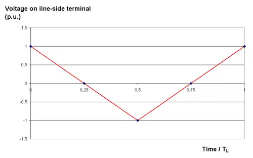 A short-line-fault is a fault that occurs on a line a few hundred meters to several kilometers down the line from the circuit breaker terminal. As shown on Figure 5, the TRV is characterized, in its initial part, by a steep rate-of-rise due to a high-frequency oscillation produced by travelling waves that travel on the line with positive and negative reflections at the circuit breaker terminal and at the fault point, respectively.[1] The superposition of these travelling waves gives the voltage profiles on the line shown on Figures 6 to 14 with, on the horizontal axis, the circuit breaker terminal position on the left and the short-circuit point on the right.