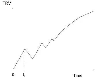 Figure 15 shows, as function of time, the variation of voltage on the line-side terminal of the circuit breaker. The voltage variation is two times the initial voltage if losses are neglected, in reality it is approximately 1.6 times the initial voltage. The triangular waveshape of voltage on the line-side terminal, combined with a supply-side voltage variation at a lower frequency, produces the sawtooth variation of TRV shown on Figure 5.