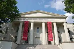 The academic side of campus lies east of North Broadway, one of the major streets in Lexington. Old Morrison is the central administration building. Designed by pioneer Kentucky architect Gideon Shryock and erected in 1833 under the supervision of Henry Clay (then professor of law at Transylvania), Old Morrison is the central image on Lexington's city seal. It houses the offices of financial aid, accounting, the registrar, the president, the dean, communications, the Center for Academic and Professional Enrichment, and more. The building also holds the tomb of Constantine Rafinesque, professor of natural science at the university from 1819 to 1826, and Sauveur Francois Bonfils, who taught at the university from 1842 to 1849 (a native of France, he was forced to flee because of political discord).[15] During the Civil War, Old Morrison was a hospital for Union and Confederate soldiers.[16] It was gutted by fire in 1969 but renovated and reopened in 1971. It was designated a National Historic Landmark in 1965 in recognition of the university's status as the oldest west of the Allegheny Mountains.[17]
