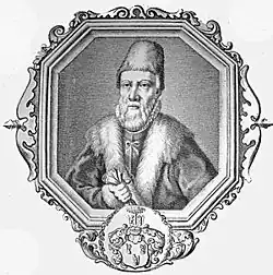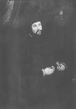 The Swedish delegation in Roskilde consented to all Danish and Lübeck demands.[2] The Dano-Swedish treaty thus included the restoration of the pre-war borders between the kingdoms, except for the Swedish dominion in Estonia, established in 1561 during the Livonian War, which was to be ceded to Magnus of Holstein, brother of the Danish king.[2] Furthermore, the Swedish crown was obliged to pay for the Danish war costs from 1563 to 1568.[2] The draft was signed on 18 November 1568 by the Swedish envoys Jören Ericksson Gyllensterne (Jörgen Gyldenstiern of Fouglevig), Ture Bielke (Thure Bielcke of Salestad) and Niels Jensson (secretary), and for the Danish side by Peer Oxsse (Per or Peder Oxe of Gisselfeld, hofmester), Johan Friis (Frijs of Hesselagger, chancellor), Holger Rossenkrantzs (Holger Ottesen Rosenkrantz of Boller, governor in North Jutland), Peder Billde (Bilde of Svanholm, commander of Callundborg) and Nils Kaass (Kaas of Taarupgaard, secretary).[5]