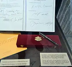 The treaty was signed on 25 April 2005, in Neimënster Abbey, Luxembourg.[7] In addition to the Treaty of Accession a Final Act was signed. The Final Act registers the results of the accession negotiations,[8] including any declarations made by the parties.[9] It also laid down arrangements for the period between signing and entry into force of the treaty.[10] Ratification of the Treaty of Accession is summarized in the table below. The process was completed on 20 December 2006.