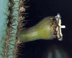 Species of the genus Pilosocereus are columnar cacti with a shrubby or tree-like habit. Some may be up to 7 m (23 ft) tall. They may be unbranched, or have a dense mass of branches. The stems vary widely in the number of ribs and spines. The areoles may have long or short hairs, sometimes with more silky hairs on flowering areoles than on non-flowering ones. A few species have a pseudocephalium. The flowers usually open at night and may smell strongly of garlic. The fruits have white, red-purple or other-colored pulp when ripe.[5][6]