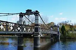 The river continues north-east, passing the village of Walton-on-Trent until it reaches the large town of Burton-upon-Trent. The river in Burton is crossed by a number of bridges including the ornate 19th-century Ferry Bridge that links Stapenhill to the town.[11] To the north-east of Burton the river is joined by the River Dove at Newton Solney and enters Derbyshire, before passing between the villages of Willington and Repton where it turns directly east to reach Swarkestone Bridge. Shortly afterwards, the river becomes the Derbyshire-Leicestershire border, passing the traditional crossing point of King's Mill, Castle Donington, Weston-on-Trent and Aston-on-Trent.[11]