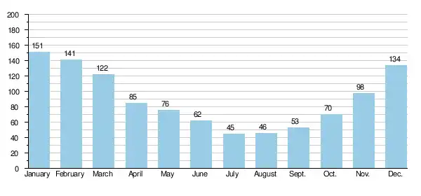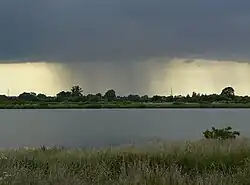 Rainfall in the catchment generally follows topography[48] with the highest annual rainfall of 1,450 mm (57 in) and above occurring over the high moorland uplands of the Derwent headwaters to the north and west, with the lowest of 580 mm (23 in), in the lowland areas to the north and east.[49] Rainfall totals in the Tame are not as high as would be expected from the moderate relief, due to the rain shadow effect of the Welsh mountains to the west, reducing amounts to an average of 691 mm (27.2 in) for the tributary basin.[48][50] The average for the whole Trent catchment is 720 mm (28 in) which is significantly lower than the average for United Kingdom at 1,101 mm (43.3 in) and lower than that for England at 828 mm (32.6 in).[51][52][53]