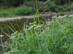 After passing under Schlicher's Covered Bridge and a pedestrian footbridge, the Jordan Creek makes a hairpin curve, ultimately turning to flow straight south. To the east of the creek, in this section, arises Elk Ridge, which is the last and easterly most rise of the Schochary Ridge.[23] The elevation rise from Jordan Creek to Elk Ridge is the steepest gradient and largest elevation gain in the park. The Jordan continues under a second pedestrian bridge—erected in 1997—and over the Zoo's ford.[24] Elk Ridge Run, Macintosh Run and Thicket Run are all seasonally intermittent minor tributaries of the Jordan. Just before the ford, the Jordan is joined by Elk Ridge Run. This south flowing watercourse begins near the bison paddocks and drains the eastern slope of Elk Ridge and the western slope of the environmental center grasslands. After the ford, the Jordan Creek continues south until forming a confluence with Macintosh Run.[23]