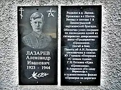 A memorial plaque to Alexander Lazarev. It mentions several Lazarev's depictions in literature and film