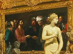 The artist also produced a pendant to the work entitled Christ with the Doctors in the Temple. Both works were originally in cardinal Carlo de' Medici's collection. On his death it passed to the Casino Mediceo di San Marco, then in 1667 the Palazzo Pitti. It finally reached its present home in the Uffizi in 1753, where it was shown in Zoffany's 1776 Tribuna of the Uffizi.[1][2]