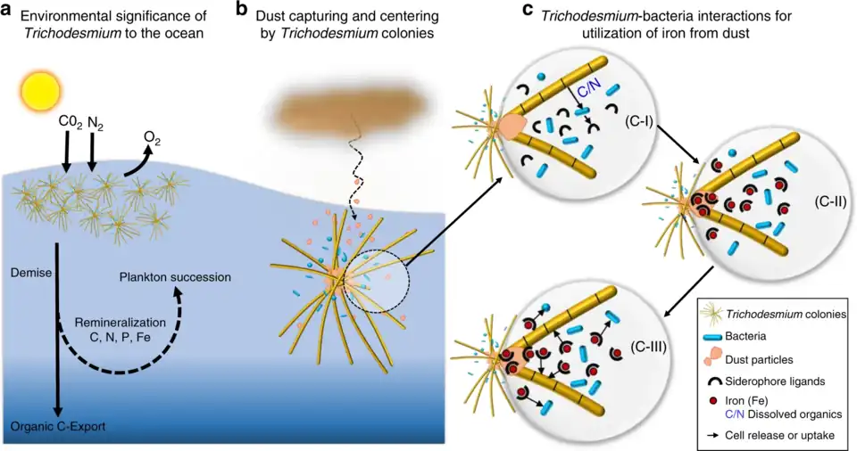 - ^ Basu, Subhajit; Gledhill, Martha; de Beer, Dirk; Prabhu Matondkar, S. G.; Shaked, Yeala (2019-08-02). "Colonies of marine cyanobacteria Trichodesmium interact with associated bacteria to acquire iron from dust". Communications Biology. 2 (1): 284. doi:10.1038/s42003-019-0534-z. ISSN 2399-3642. PMC 6677733. PMID 31396564.