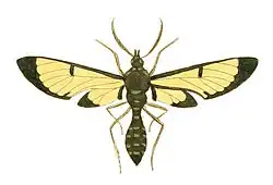 Upperside: Antennae pectinated, and thickest in the middle. Head black, with a blue spot in front. Neck blue. Thorax black, with an orange spot on each shoulder. Abdomen black; smallest next the thorax, with a row of golden-blue spots on each side, and another at the top; at the extremity is placed a hairy bristle, about a quarter the length of the abdomen. Wings yellowish and transparent. The anterior having a black narrow border running round all their edges, except the anterior ones; and in the middle of each is an oblong black spot, joining to the anterior edge, which reaches almost halfway across the wing. Posterior wings with a black border along the abdominal edges and the upper corners; the anterior and external edges having none. The extremity of the body of the male is furnished with a villose tail, as long as the body.