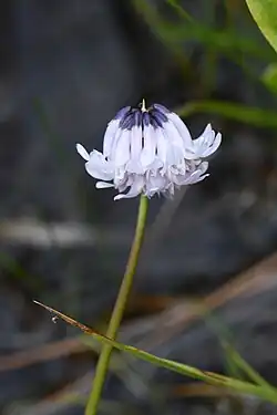 The inflorescence is a head of flowers 1 or 2 centimeters wide, the flowers soon drooping to hang from the head in a parasol-shaped arrangement. Each flower has a calyx of dark purple or black sepals that contrasts with the pale pinkish corolla. The tubular corolla measures just over a centimeter long.