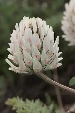 The inflorescence is crowded, egg-shaped and up to 5 or 6 centimeters long. Each flower has a calyx of sepals with lobes narrowing into bristles which are coated in long woolly hairs. The flower corolla may be nearly 3 cm in length and is pink to lavender in color,[2] or sometimes bicolored. It blooms early in spring.[2] As both the Latin and common names suggest, the flower head is unusually large for a clover.