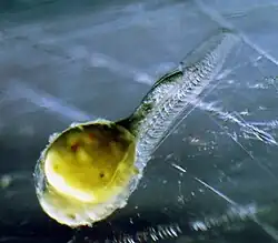 Fertile harlequin rasbora eggs require approximately 18 hours to hatch at a temperature of 28 °C. Upon hatching, the fry are translucent, around three to four millimetres long, and remain attached to the leaf upon which the eggs were laid for a further 12 to 24 hours, during which the yolk sac is absorbed. Once this process is completed, the fishes become free-swimming, and at this stage, require very fine sizes of food such as live infusoria for a period of seven to 14 days, after which the fry are able to feed upon newly hatched brine shrimp. If infusoria are unavailable, commercial prepared foods for egglayer fry may also be used.
