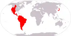 Triops longicaudatus is widespread in North America. In Canada, it is found only in the provinces of Alberta, Saskatchewan and Manitoba.[7] It is widespread throughout the contiguous United States, Mexico, and Hawaii, but not Alaska. Tadpole shrimps may be found in parts of South America (Argentina and Galápagos Islands),[8] in the West Indies, and the Pacific Islands, including Mongolia, Japan, South Korea, and New Caledonia.[9]