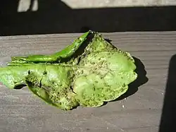 Trioza erytreae is confined to host plants in the family Rutaceae. It occurs on wild plants such as horsewood and white ironwood, as well as on citrus, especially lemons and limes. A female psyllid can lay up to 2000 eggs over the course of a four- to seven-week period.[1] Eggs are laid on the margins of new leaf growth and are anchored by short stalks. They hatch after 7 to 14 days, and the first-instar nymphs start to feed on the underside of the leaves where they begin to form galls. The feeding of a large number of nymphs causes curling of the leaves, distortion of shoots, and even cessation of growth. The nymphs moult five times before becoming winged adults. The nymphal development stage lasts between 20 and 40 days depending on temperature.[5]