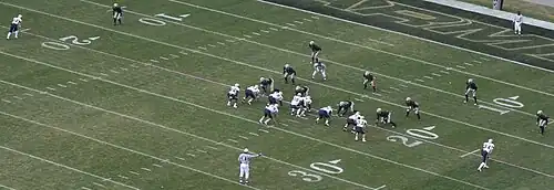 The triple option forces defenses to worry about multiple running options on a single play. For the offense, the decision of who is to carry the ball—which option to use—is made during the play by the quarterback (QB).[1] The QB makes the decision whether to give the ball to the fullback (FB) or, based on his read of the defense, to keep the ball. If the QB does choose to keep the ball after the initial snap, he still retains the third option of handing the ball off to the tailback. If, for example, the defensive end (DE) is blocking the FB or for any other reason it appears to him that his group of ball-carriers are otherwise limited, he will simply keep the ball himself instead of handing it off. If the DE runs straight upfield or directly at the QB, then the QB gives the ball to the FB. The triple option can be complemented by fixed running plays which look like the triple option when they start, but use traditional blocking, as well as play-action passing.