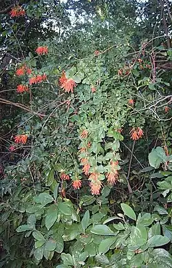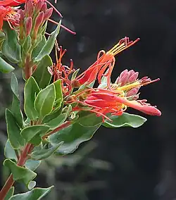 Tristerix is a genus of mistletoe in the family Loranthaceae, native to the Andes, ranging from Colombia and Ecuador to Chile and Argentina.[2][3] They are woody perennials usually occurring as aerial parasites, are pollinated by hummingbirds and flowerpiercers, with seed-dispersal generally by birds but occasionally by mammals (Dromiciops).[3] The genus is distinguished from other New World Loranthaceae by its simple, terminal, racemose inflorescences, together with its of 4- or 5-merous flowers, versatile anthers, and the presence of endosperm.[2] Further differences include fused cotyledons and the absence of epicortical roots.[2]