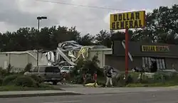 The tornado outbreak associated with the storm began with an F0 in St. Bernard Parish that destroyed a boat house.[23] A short-lived F1 tornado touched down in Reserve, striking a private high school, where it destroyed half of one classroom and damaged several others. Later, the F1 tornado passed through a trailer park and severely damaged or destroyed 20 trailers. One trailer with a woman and three children was lifted into the air and dropped 30 feet (9.1 m) away; four occupants were injured, none of them seriously. Damage from the tornado amounted to $2 million (2003 USD, $3.42 million 2025 USD).[24] A third tornado, rated an F0, struck Orleans Parish, damaging a car and a portion of a roof.[25]