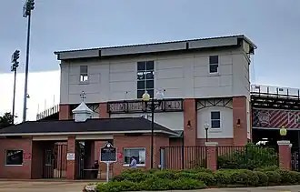 The stadium features a brick concourse, a three-story press box, restrooms, a concession stand, and a merchandise booth. The stadium has a capacity of 2,000 spectators, which includes 1,700 bleacher seats and 300 chair-back seats. More spectator areas are located beyond the left field fence and adjacent to the home plate dugout. The Lott Baseball Complex was built along the left field fence, which houses coaches offices, player locker rooms and lounge, and an indoor batting cage.