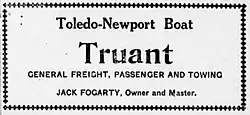 On the Fourth of July, 1910, Truant was scheduled to make extra excursion runs from Toledo to Newport, to leave Toledo at 7 a.m., 12:30 p.m., and 7:30 p.m., and departing Newport for Toledo at 10 a.m., 6 p.m., and immediately after the dance at night.[18] The round trip fare was 75 cents, 25 cents more than the usual Sunday excursion fare to Newport on Truant.[18]