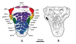 Tsagantegia was a medium to large-sized ankyosaur, with an estimated length of 6 to 7 m (20 to 23 ft)[5][6] and weighing about 1 to 4 t (2,200 to 8,800 lb).[6] The skull measures about 38 cm (380 mm) in length, with a near width of 25 cm (9.8 in), missing the lower jaws. Unlike other Asian ankylosaurs, in Tsagantegia the caputegulae (cranial ornamentation) are not subdivided into a mosaic of polygons but are amorphous and flattened; they show some degree of symmetry. The quadratojugal, squamosal and orbital horns are poorly preserved, in contrast with other ankylosaurs. The snout was long and flat with a pointed rostrum (beak); each maxilla preserves approximately 18 alveoli, no teeth were preserved.[1][5][7] According to Arbour, Tsagantegia differs from Gobisaurus and Shamosaurus based on the more rounded, U-shaped premaxillary beak and the flat ornamentation.[8]