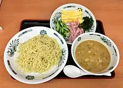 Tsukemen is a Japanese noodle ramen dish in Japanese cuisine consisting of separate servings of noodles and soup or broth, whereby the noodles are dipped in the soup.[2][3] Soba and udon are some types of noodles used in the dish.[2][4][5] The noodles are typically served cold, while the soup is typically served hot, which serves to season and moisten the noodles.[2][3] The noodles can also be served at room temperature.[6] Additional ingredients used in the dish are typically served atop or on the side within the dish of noodles.[6] Some additional ingredients used include nori, chashu, menma, tamagoyaki and boiled eggs.[6][7]