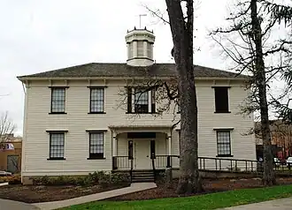 Sitting atop its hipped roof is an octagonal shaped louvered belfry, similar to one that was on the Oregon Institute building. The rectangular shaped hall is divided by a centralized cross hall.[5] Colonial Revival in style,[4] the structure was added to the National Register of Historic Places as Tualatin Academy in 1974.[8] The downstairs of the building houses the Price Memorial Chapel and meeting space.[7] It is the oldest college building in the state[9] and was still in use as a museum and chapel in 2017.[10]