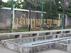 Yogyakarta Station has two locomotive monuments on the east and south sides of the station area. The monument located at the east entrance is a portable steam engine made by Marshall Britannia, United Kingdom. Its location which was originally in the middle of the station entrance has now been moved to the north wing of the road. Meanwhile, the monument located on the south entrance is the D301 22 hydraulic diesel locomotive which has been on display since 12 December 2018. The locomotive display was carried out after all parts of the station underwent an overhaul, including adding toilets from used cars and can be used by the general public.[18][19] In addition to the locomotive monument, near the east entrance, there is the words "Yogyakarta Station" in Javanese script, made in large raised letters.