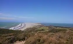 Farewell Spit forms the northern side of Golden Bay and is the longest sandspit in New Zealand, including around 25 kilometres (16 mi) of stable land and another 5 kilometres (3.1 mi) of mobile sand spit. The spit runs from west to east, and is formed from fine golden-coloured quartz sands, derived from the erosion of granites and other rocks in the Southern Alps, and transported northwards along the West Coast by longshore drift with the Westland current.[2][4]