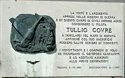 On Sunday 2 July the second stage, Catania-Palermo, began. Whilst he was over the beach of Mare Grosso, near Messina, the propeller failed and it lost a blade. Covre, now in full emergency, tried to land on the beach below that was crowded with bathers and students, he gestured from the window, but his desperate signals were interpreted as a salutation. Covre decided to ditch in the sea, not a manoeuvre that should present particular difficulty for a pilot of his experience and ability. In the impact with the water he stroke his head against the metal of the radio, was knocked out and the aircraft sank. The aircraft was recovered three days later due to the strong currents. His heroic gesture would be honoured by the Carnegie Foundation, that awarded Covre with the silver medal for Civil Valour: "The board of directors at the meeting of 30 May 1963 have granted the medal of second degree to the memory of Tullio Covre, pilot, for the following act of heroism performed on 2 July 1961 in Messina: "Whilst he was participating in the Tour of Sicily by aeroplane, finding himself in difficulty due to an engine failure, he tried to carry out a forced landing on the beach, attempting to distance the numerous bathers, amongst which there were children from a colony; but his signals were interpreted as a greeting wave and no one moved away. To avoid a massacre he managed to turn the aircraft out to sea, going down with the aircraft: a shining example of the most noble altruism." The memory of Tullio Covre was also remembered on a commemorative stone place at the airport of Boscomantico in 1962. The Italian Air Force awarded him the Silver Medal of Aeronautic Valor. Verona has dedicated a street to his name.