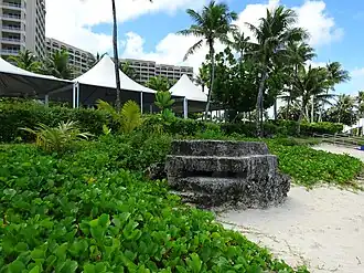 There are three pillboxes on or near the beach of Tumon Bay, all made from concrete mixed with coral limestone. The first is a partially-collapsed concrete structure between the Hyatt Regency Guam and the beach; it has two embrasures providing gun placements facing north and west.[2] The second is located south of the first, north of the Holiday Resort and Spa; it has an entrance (damaged) to the south, with wall extensions, and a gun opening facing roughly east, with a view over much of the bay and coastline.[3] The third is located further west, near the Fiesta Resort Guam, and is further inland (about 50 metres (160 ft) instead of the 6–7 metres (20–23 ft)) than the first two, having been relocated from its original position closer to the beach. It is six-sided, a roughly rectangular shape with two corners clipped, with gun openings on the short side and angled sides.[4]