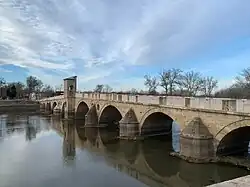 Downstream from the village of Knyazhevo the Tundzha enters the long picturesque Srem Gorge between the Sakar mountain range to the west and the Dervent Heights to the east.[6] The gorge is narrow, reaching some 100–200 m, with steep bare slopes and rocky uneven riverbed. There is a small widening of 0.8–1 km between the villages of Srem and Ustrem, after which the gorge narrows again with deforested slopes and in places almost canyon-like. In that section the river is about 60 m wide with an average depth of 1–2 m. Shortly after exiting the gorge the river forms the Bulgaria–Turkey border for about 10 km. East of the village of Matochina the Tundzha leaves Bulgaria and enters Turkey, where it flows into the Maritsa at an altitude of 32 m in the city of Edirne.[1][2][5]